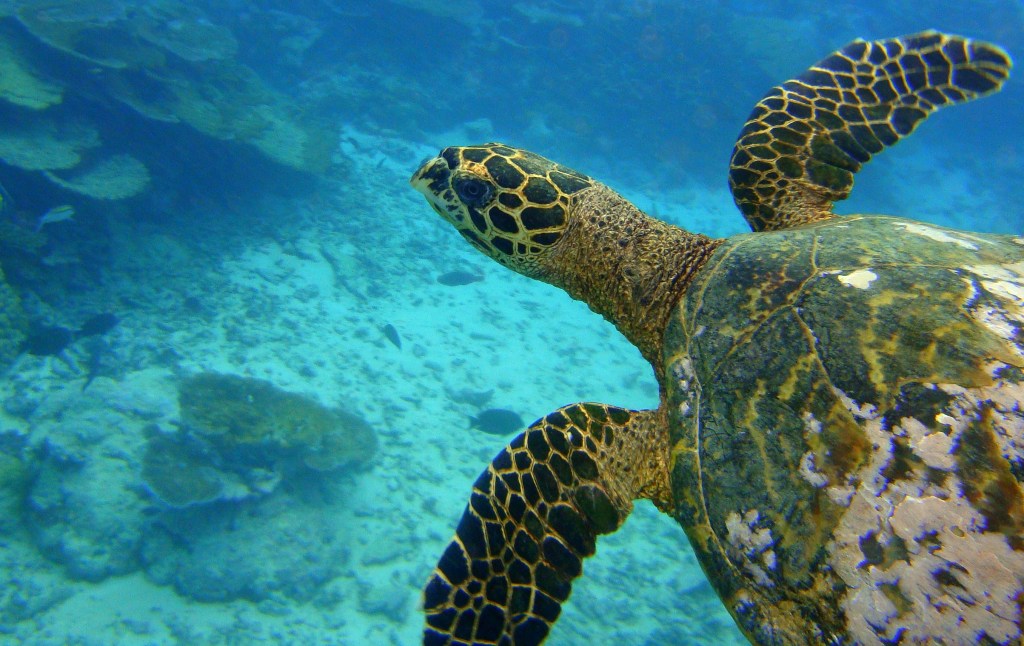 A Laumei, shown here is a Green Turtle which is the most common turtle in Samoa’s waters. It breeds on Rose Atoll in American Samoa and feeds on seagrass. The Hawksbill Turtle (also Laumei), which feeds on sponges, are the only turtles known to breed in Independent Samoa but are less commonly seen than Green Turtles. Photo by Richard Howes.