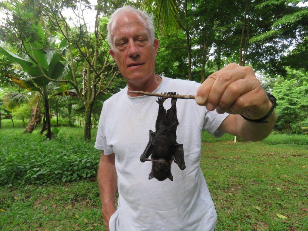 Dr Greg Sherley holding a baby Pe’a fai taulaga (Tongan Fruit bat) that fell out of a tree (we returned it!). One of only three native mammals in Samoa- all members of the bat family. Flying foxes are critical seed dispersers and pollinators of native plants and although fully protected they are still hunted for food.