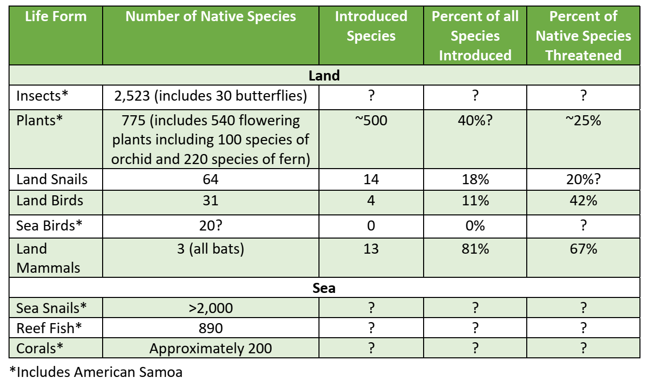 Because of our distance from the source areas of species evolution, Samoa has fewer species of animals and plants than islands further west, especially for some groups such as land mammals (only 3 native species) and with entire groups being absent (such as amphibians including frogs).