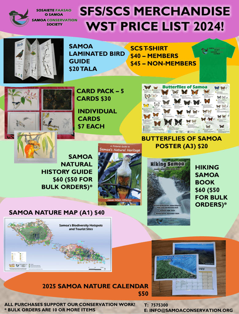 Support our conservation work by buying some of our merchandise which includes t-shirts, greeting cards, butterfly posters, laminated bird guides, natural heritage books, hiking Samoa books, A1 maps of Samoa’s scenic sites and 2025 Samoa nature calendars. Items are all available from our offices at Mulinu’u.