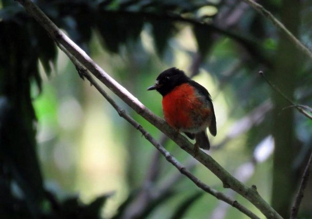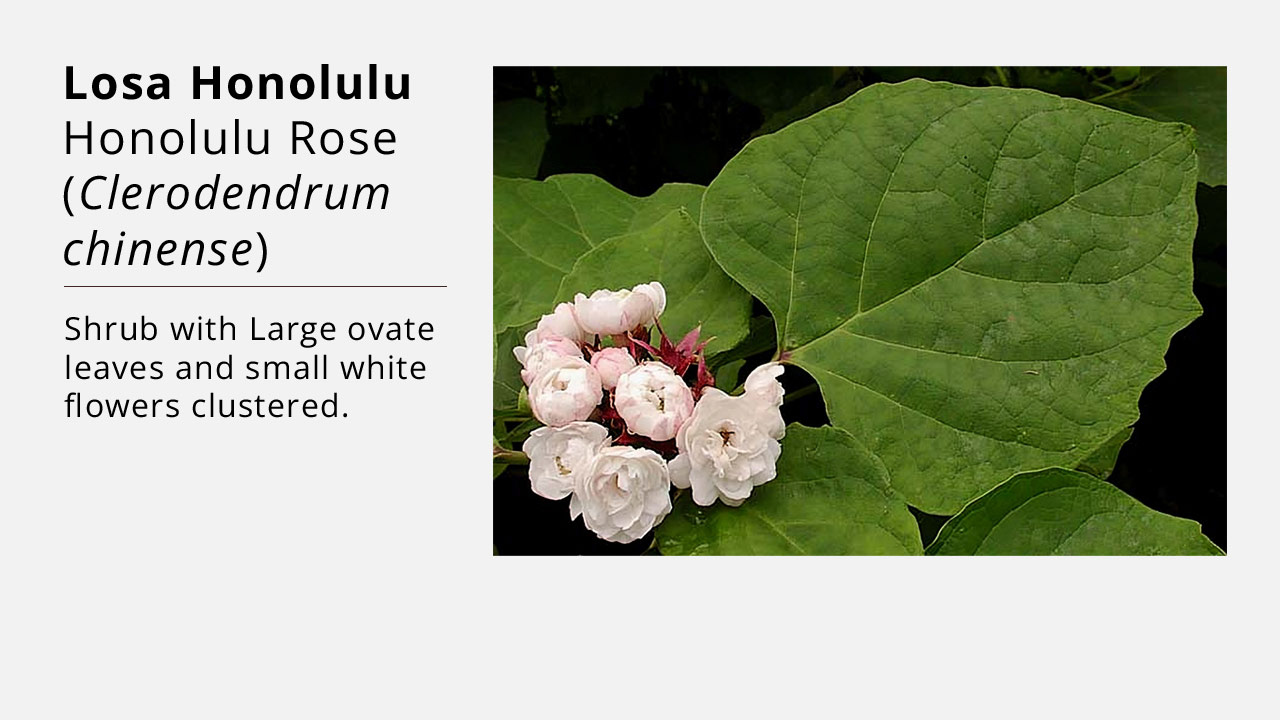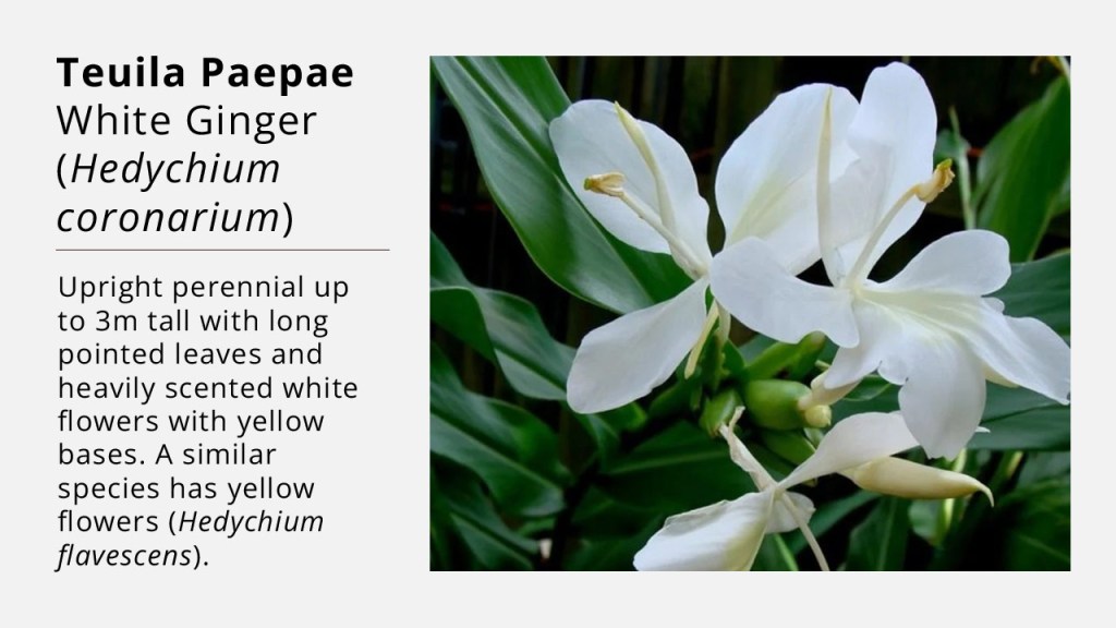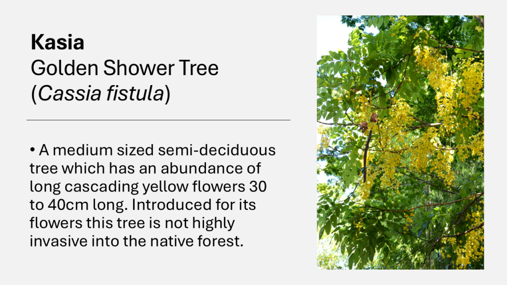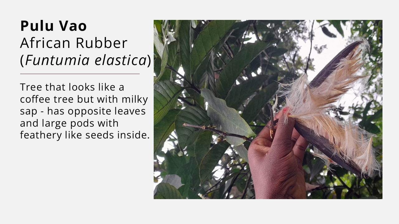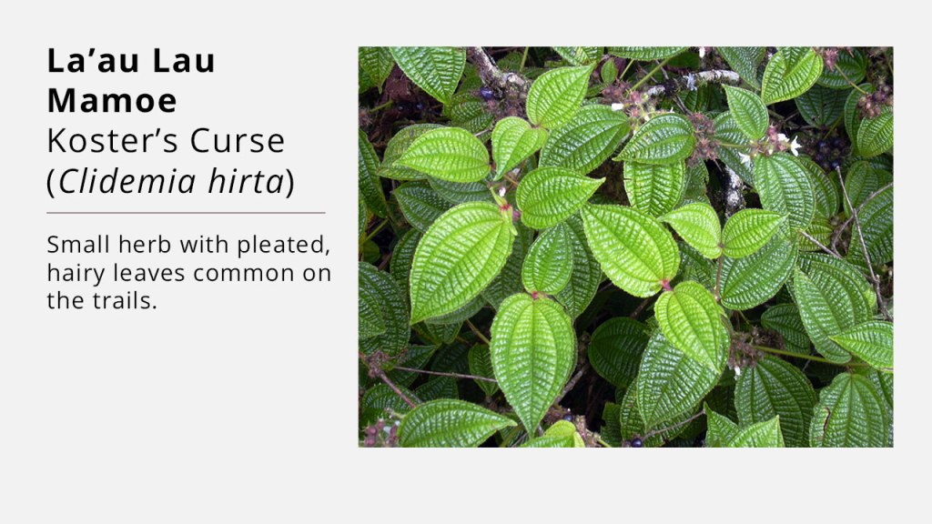 In this part of the reserve most of the plants are introduced invasive species, many of which may have escaped cultivation from the gardens and forest research plantation at the base of the mountain. These species dominate because of their fast growth and rapid dispersal ability, with many dispersed by wind. Five invasive trees are particularly dominant here including Silk Tree (Tamaligi) species, African Tulip (Fa’apasi) and rubber trees such as African Rubber (Pulu Vao) and Panama Rubber (Pulu Mamoe). In addition there are at least 20 other common invasive plants in the reserve including Koster’s Curse (La’au mamoe), Shoebutton Ardisia (Togo Vao), Cardinal Flower (Totoe), Dumb Cane, Honolulu Rose (Losa Honolulu), Heliconias (Vae pa’a), Gingers (Teuila/Fiu), Lantana (Latana), Ivy Gourd and even the Panama Hat Palm- the plant used to make Panama hats in South America! Other invasive species found in the reserve include invasive mammals such as rats, cats and pigs, invertebrates like Giant African Snail (Sisi Afelika) and introduced birds such as Myna birds and many other species.