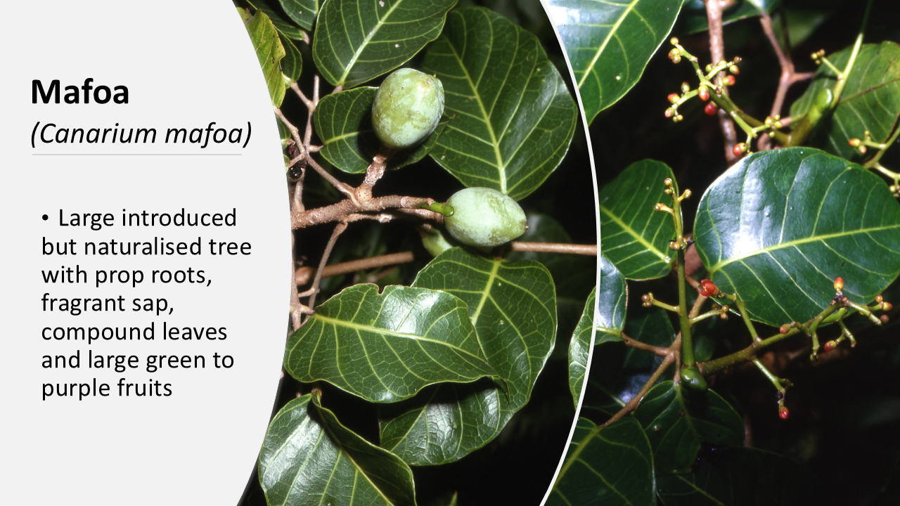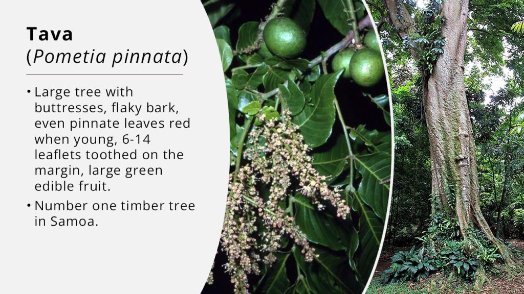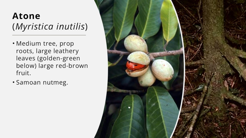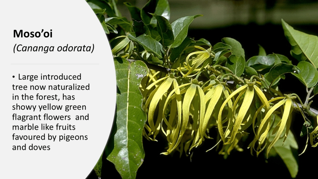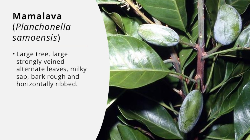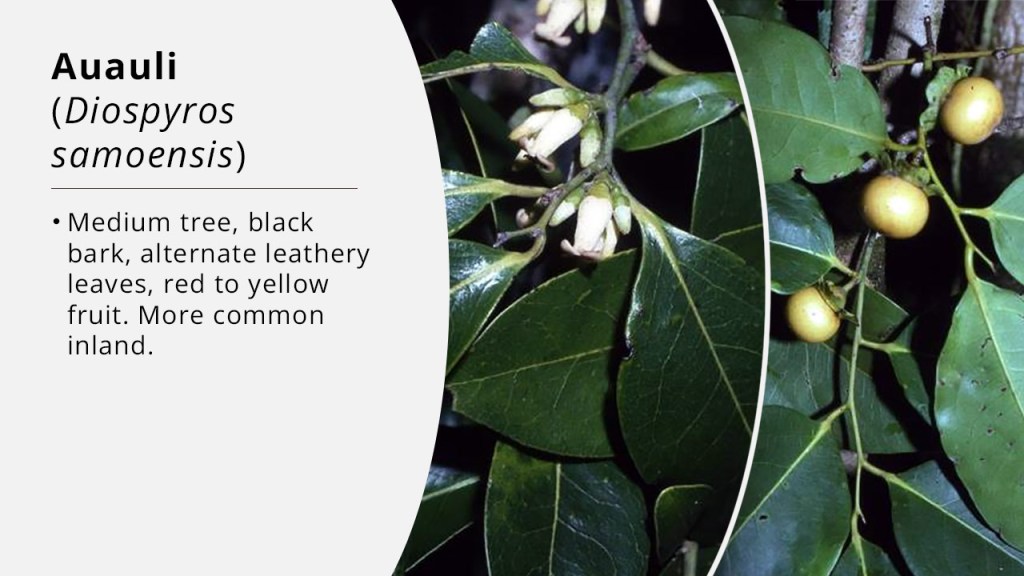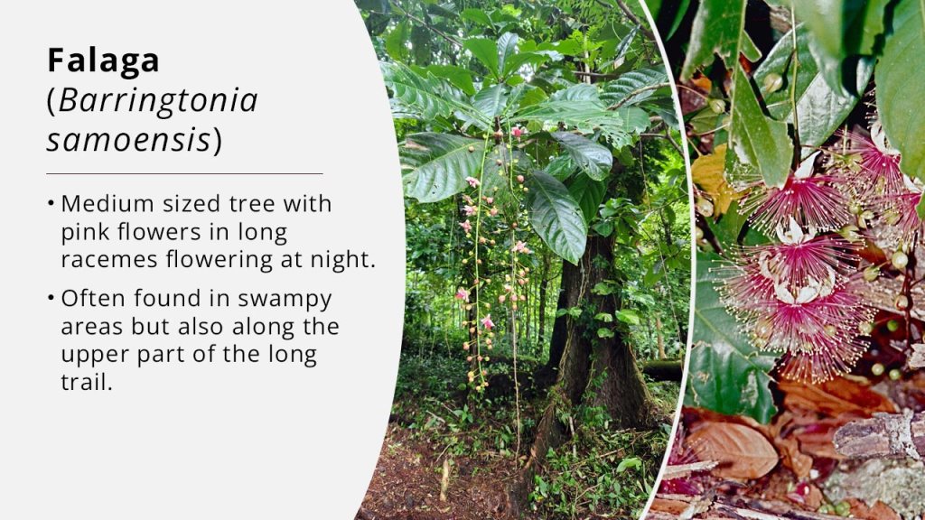 Along the long trail are some large native trees including Tava (Pometia pinnata), Ma’ali (Canarium vitiense), Gasu (Palaquium stehlinii), Mamalava (Planchonella samoensis), Asi Toa (Syzygium inophylloides), Ifi (Inocarpus fagifer), Maota (Dysoxylum maota) and Maota Mamala (Dysoxylum samoense). Common sub canopy trees include Falaga (Barringtonia samoensis) and Atone (Myristica inutilis). The less common native trees include: Ala’a (Planchonella garberi), Tamanu (Calophyllum neo-ebudicum), and Au’auli (Diospyros samoensis). Also look out for the giant Aoa, or Banyan Trees (Ficus prolixa and Ficus obliqua).