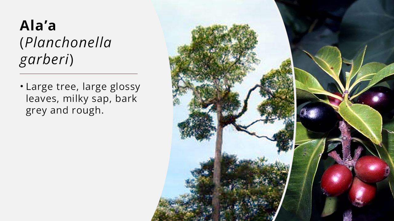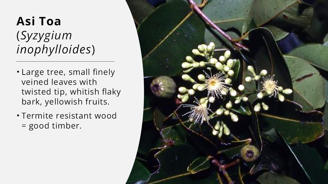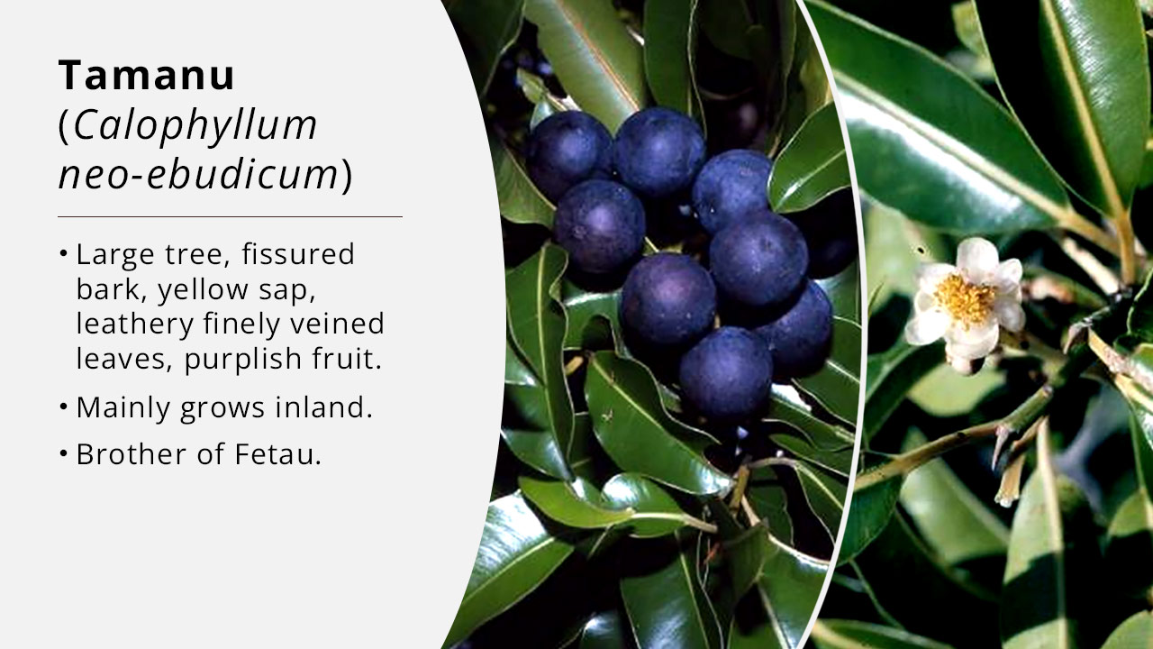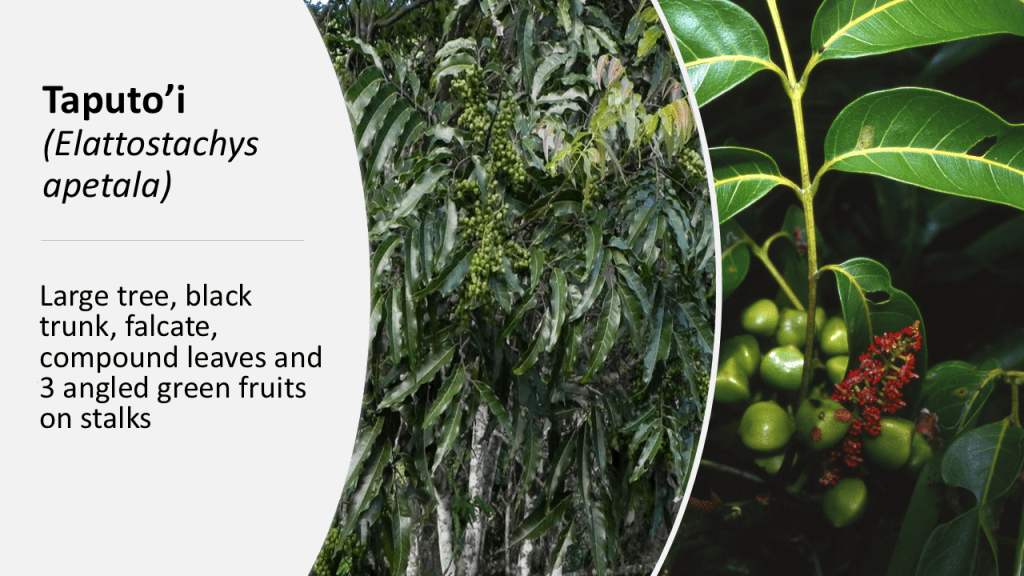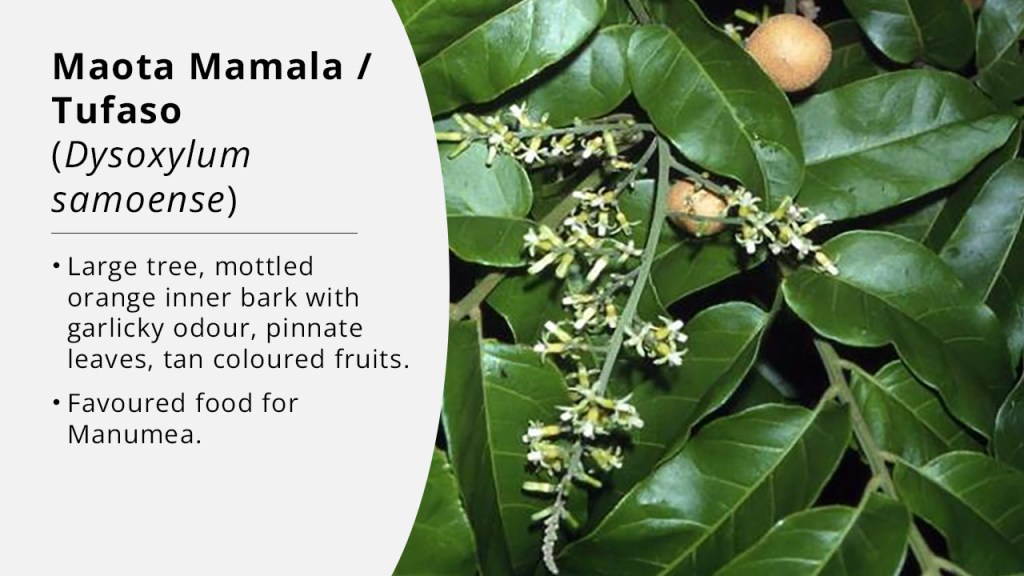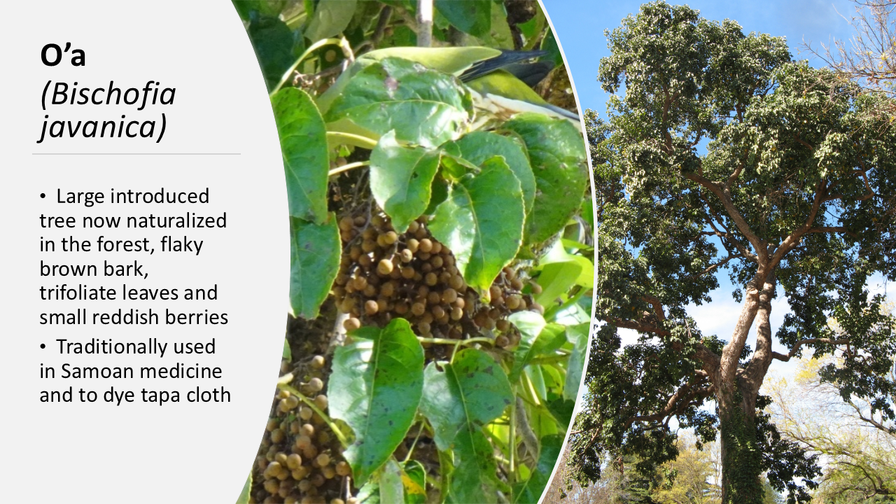 Along the long trail are some large native trees including Tava (Pometia pinnata), Ma’ali (Canarium vitiense), Gasu (Palaquium stehlinii), Mamalava (Planchonella samoensis), Asi Toa (Syzygium inophylloides), Ifi (Inocarpus fagifer), Maota (Dysoxylum maota) and Maota Mamala (Dysoxylum samoense). Common sub canopy trees include Falaga (Barringtonia samoensis) and Atone (Myristica inutilis). The less common native trees include: Ala’a (Planchonella garberi), Tamanu (Calophyllum neo-ebudicum), and Au’auli (Diospyros samoensis). Also look out for the giant Aoa, or Banyan Trees (Ficus prolixa and Ficus obliqua).