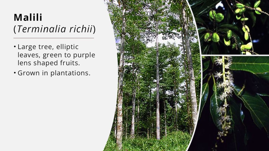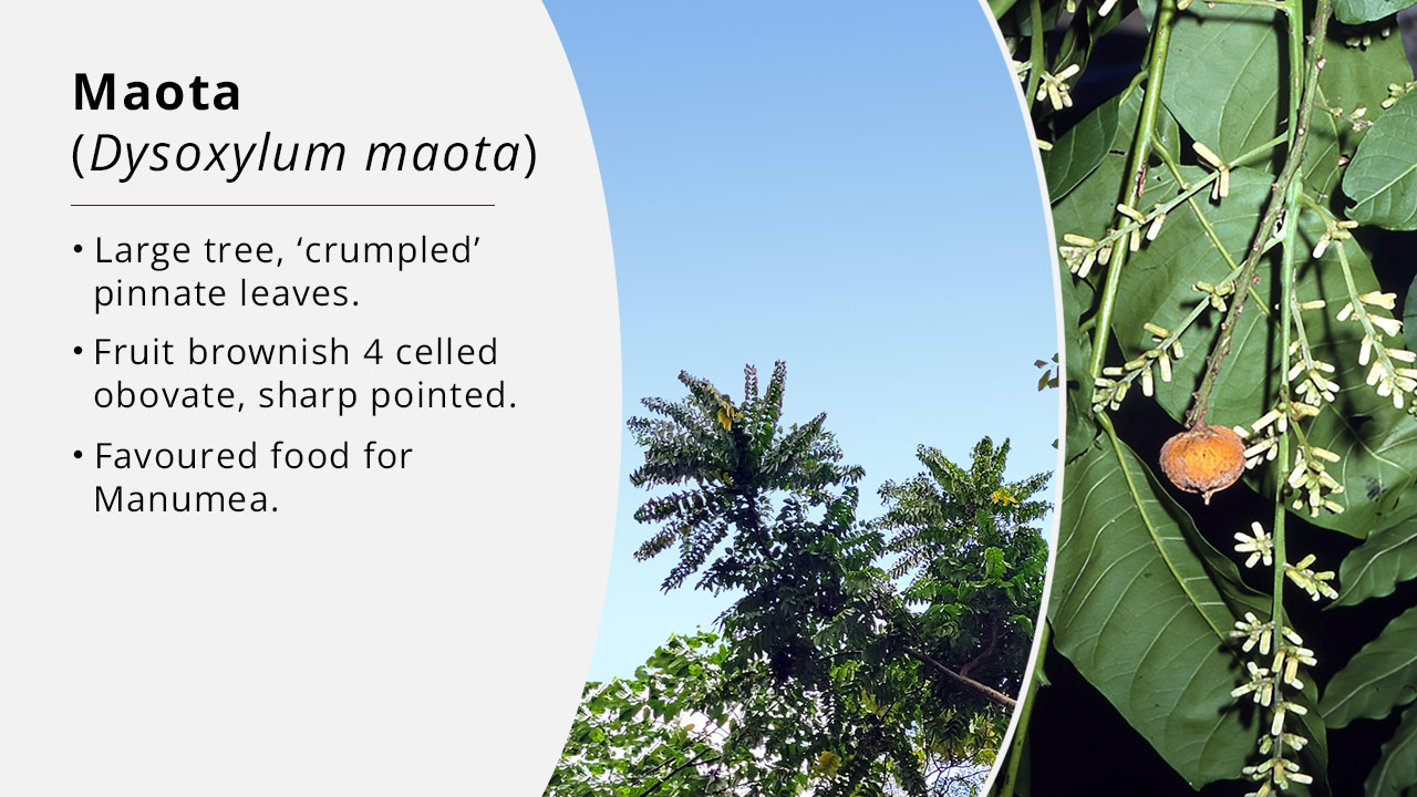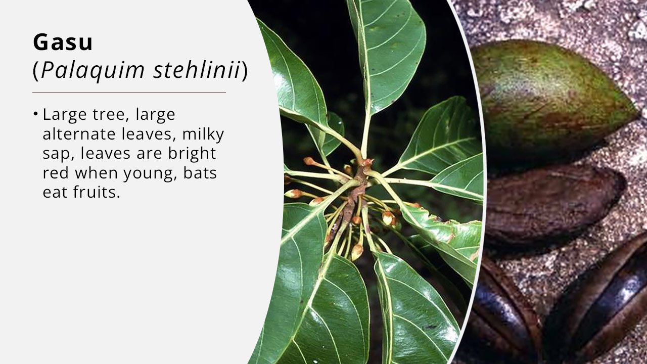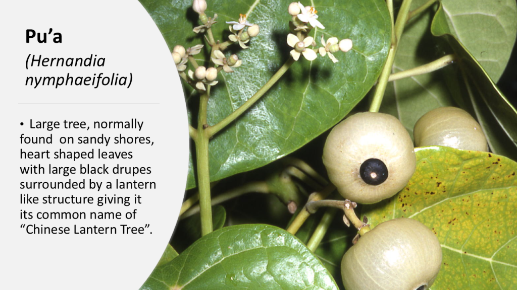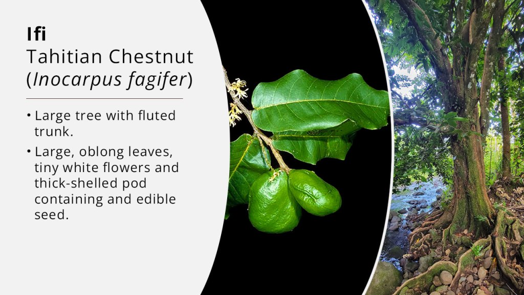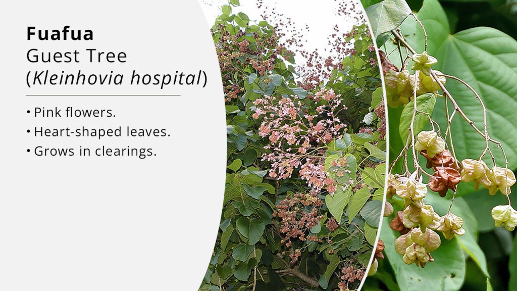 Along the long trail are some large native trees including Tava (Pometia pinnata), Ma’ali (Canarium vitiense), Gasu (Palaquium stehlinii), Mamalava (Planchonella samoensis), Asi Toa (Syzygium inophylloides), Ifi (Inocarpus fagifer), Maota (Dysoxylum maota) and Maota Mamala (Dysoxylum samoense). Common sub canopy trees include Falaga (Barringtonia samoensis) and Atone (Myristica inutilis). The less common native trees include: Ala’a (Planchonella garberi), Tamanu (Calophyllum neo-ebudicum), and Au’auli (Diospyros samoensis). Also look out for the giant Aoa, or Banyan Trees (Ficus prolixa and Ficus obliqua).
